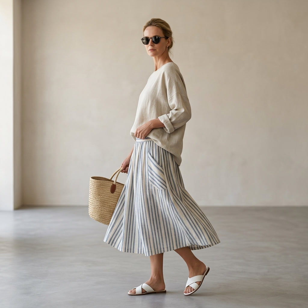 Aurora – blusa cómoda y falda midi a rayas